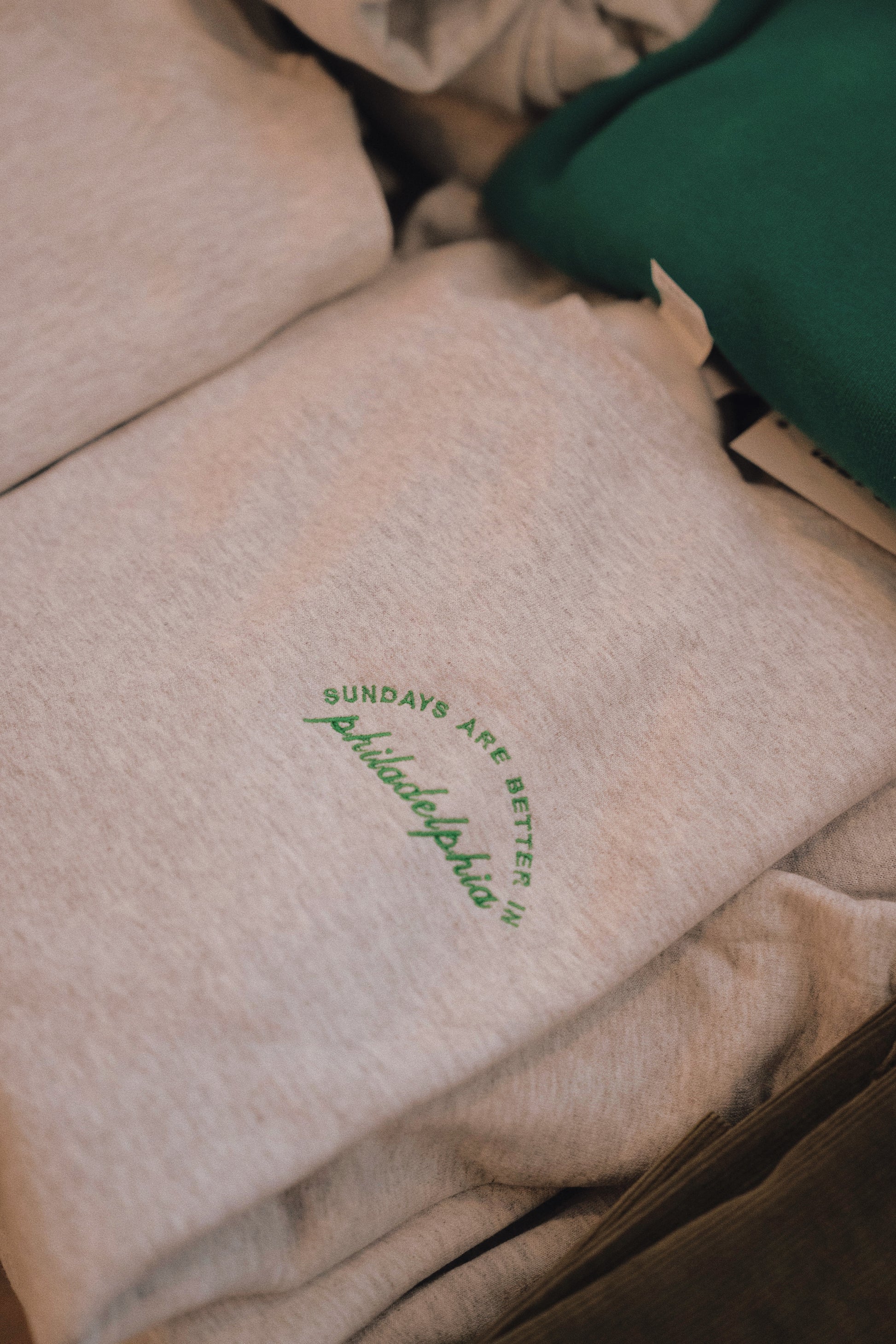 “Sundays are better in Philadelphia” embroidered in Kelly Green on left chest
